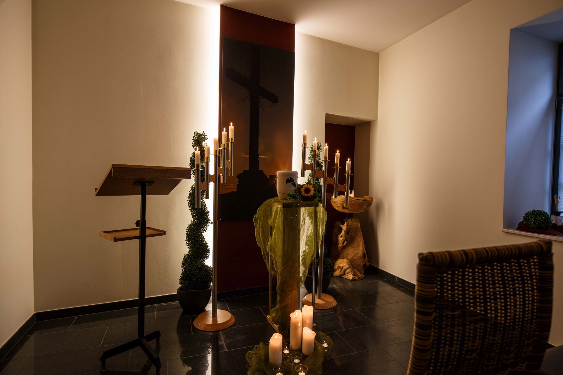 Auch ist es möglich eine Trauerfeier, ob mit Sarg oder Urne, in unseren Räumlichkeiten durchzuführen.