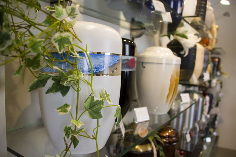 - Wir halten ein umfangreiches Sortiment bereit: Särge, Urnen, Sterbewäsche und Erinnerungsgefäße.